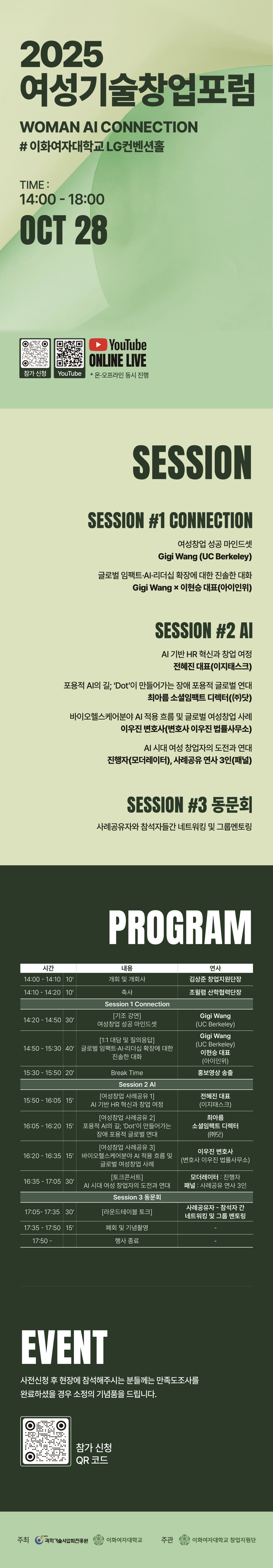 올해로 5회째를 맞는 이번 포럼은 기술창업에 도전하는 여성들이 함께 성장하고 연대할 수 있는 특별한 자리로 UC Berkeley의 Gigi Wang 교수를 비롯해 AI 기반 다양한 산업 분야에서 활약하는 여성 창업가분들과 함께 생생한 경험과 노하우를 나눌 예정입니다. 이번 포럼에서는 토크콘서트와 라운드테이블 그룹멘토링을 통해 선배 창업가들과 직접 소통하고 협력할 수 있는 기회를 제공합니다. 현장 참석이 어려우신 분들은 유튜브 생중계를 통해서도 함께하실 수 있습니다.